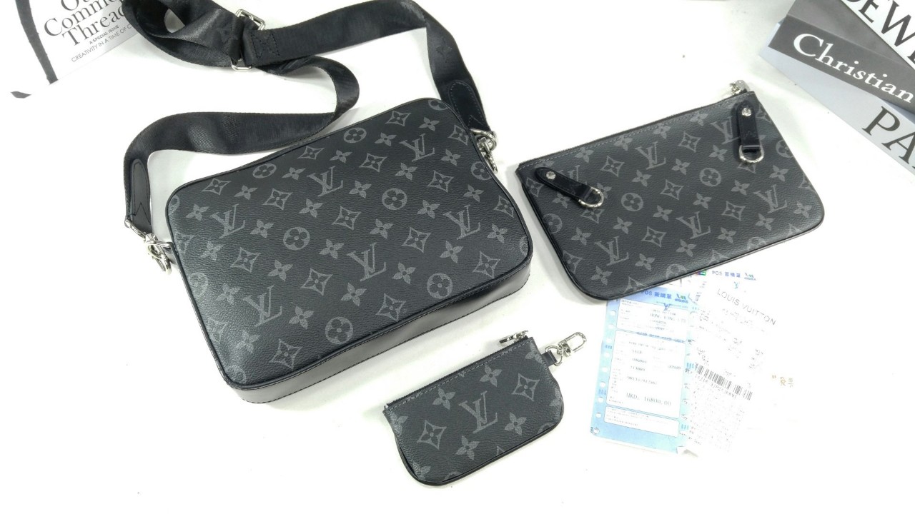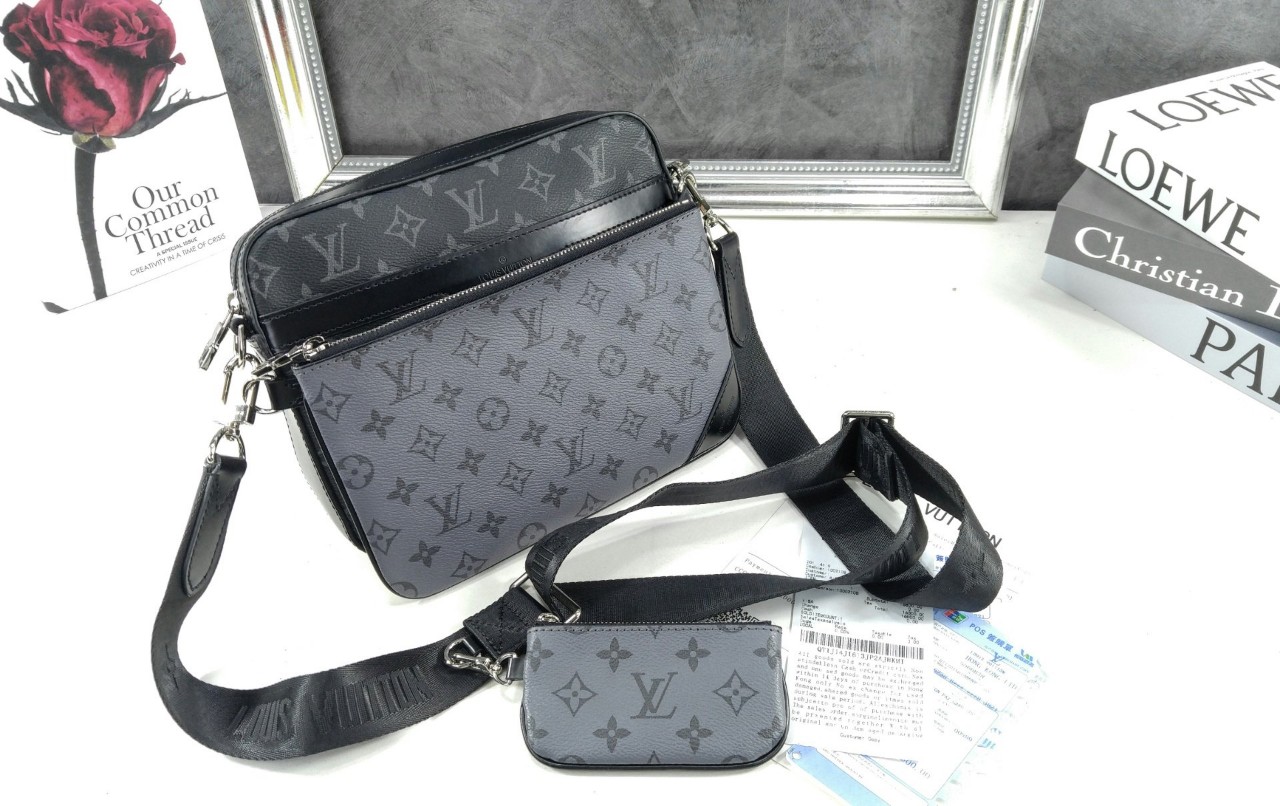모노그램 이클립스 캔버스와 모노그램 이클립스 리버스 캔버스가 조화를 이루는 트리오 메신저 남성 백. 그레이 색조의 아이코닉한 톤온톤 모티프가 돋보이는 기능적인 하이브리드 실루엣. 전통적인 크로스 바디 디자인에 탈착형 지퍼 포켓과 스트랩에 달린 동전 지갑으로 색다른 매력을 더한 아이템.