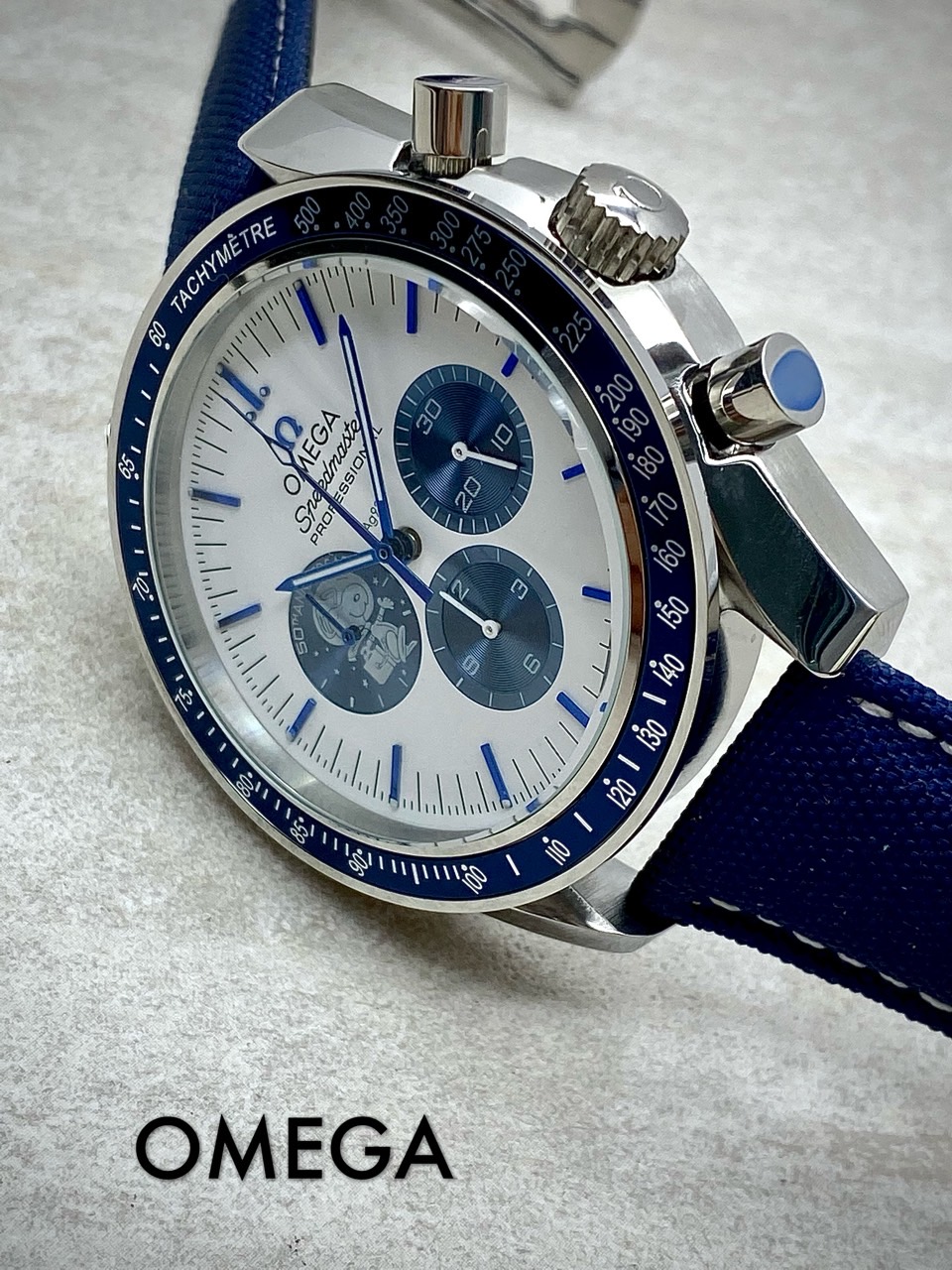 42mm의 스테인리스 스틸 케이스는 아폴로 13호 미션의 궤적이 새겨진 블루 나일론 패브릭 스트랩과 조화를 이룹니다. 실버 다이얼은 각 형태의 블루 PVD 아워 마커 및 핸즈와 9시 방향 서브 다이얼에 새겨 넣은 실버 스누피 메달리언이 돋보입니다