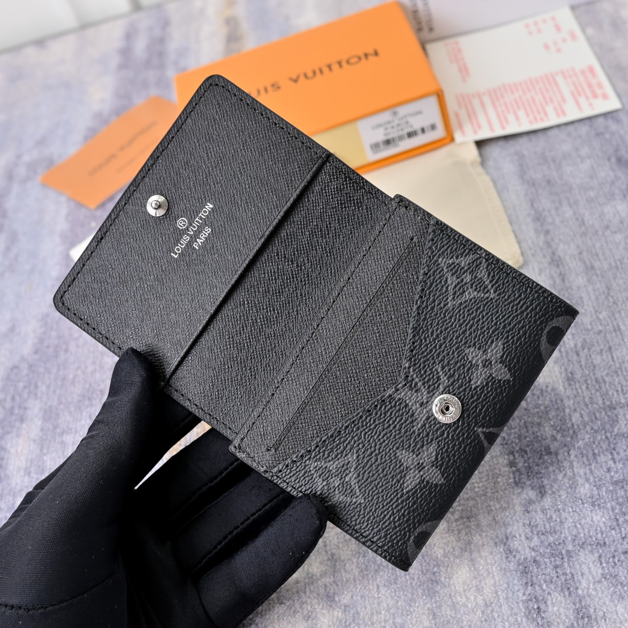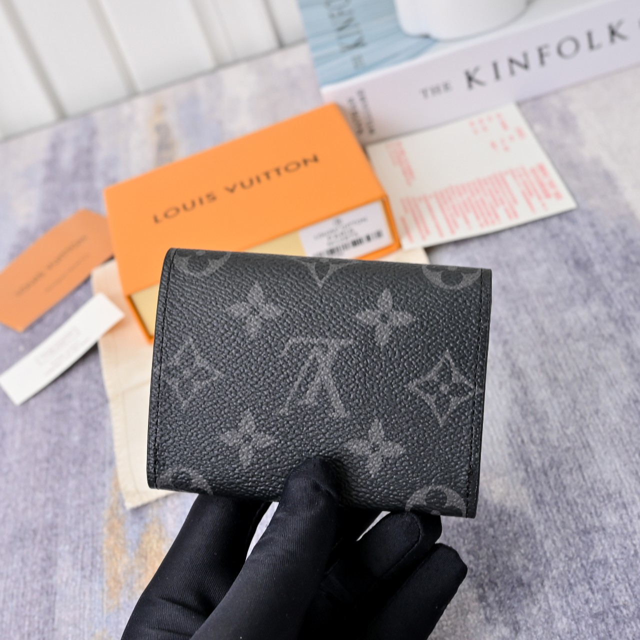 심플하면서도 우아한 모노그램 이클립스 코팅 캔버스 소재로 선보이는 미니멀한 엔벨로프 비즈니스 카드 홀더. 프레스 스터드로 잠글 수 있는 플랩. 명함을 위한 카드 슬롯 및 작은 소지품을 수납할 수 있는 거싯을 댄 수납칸으로 구성된 내부.