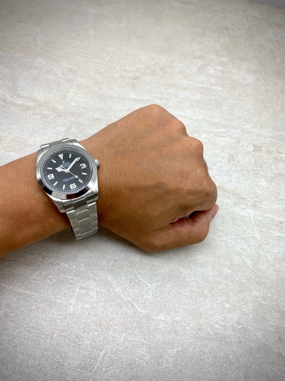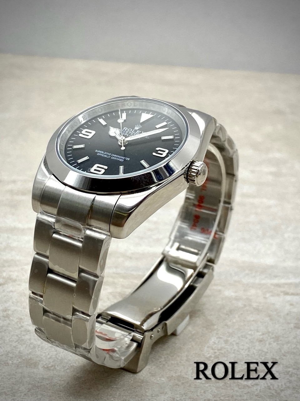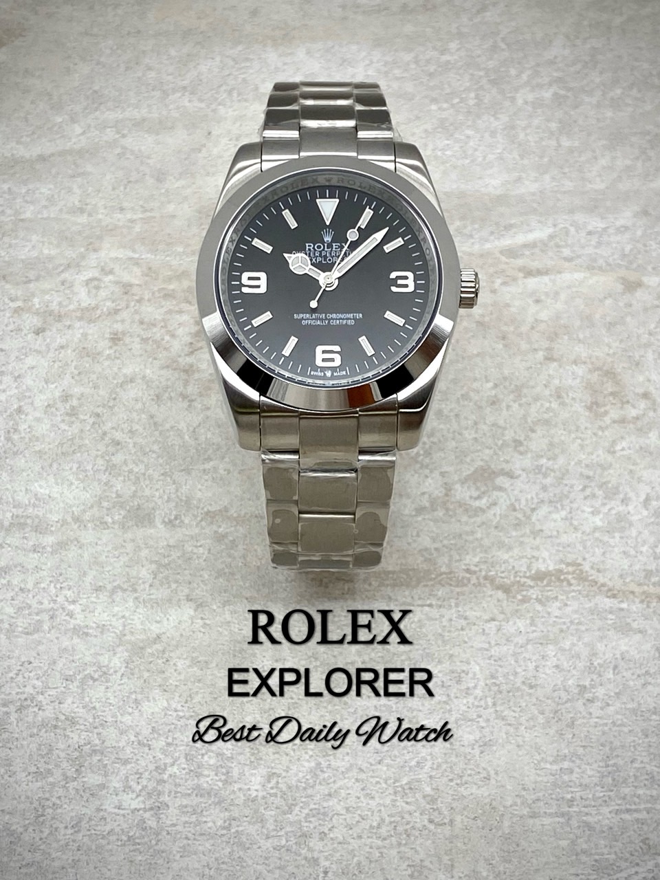 익스플로러는 히말라야 등반의 경험을 바탕으로 독특한 시침과 분침을 포함하여 익스플로러를 대표하는 가독성 높은 블랙다이얼과 3시 6시 9시 방향의 대형 아라비아 숫자를 선보여 어느곳에서도 정확히 시간을 읽을수 있도록 한 디자인입니다