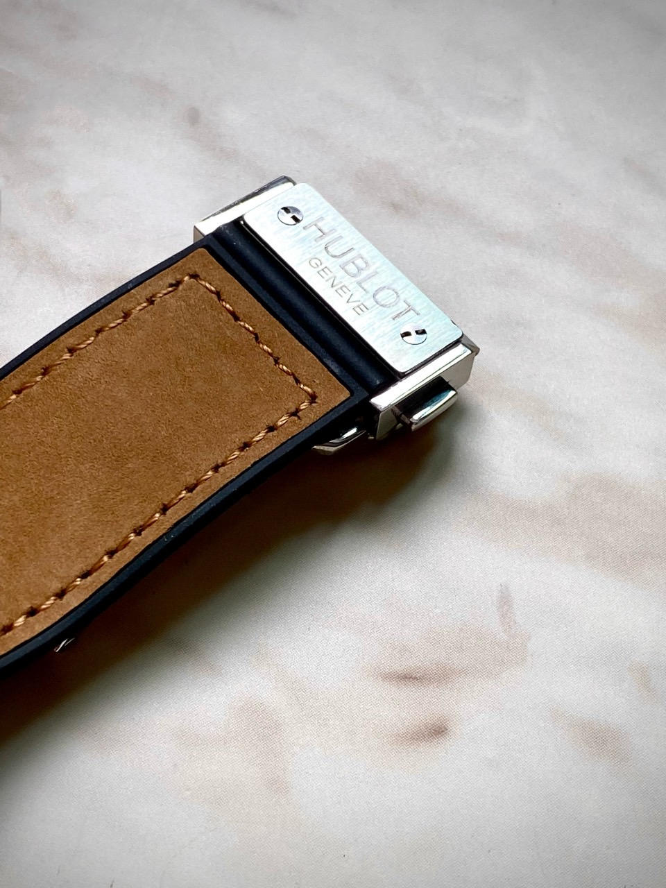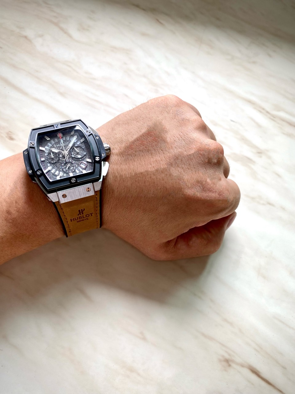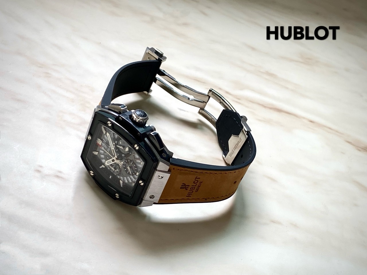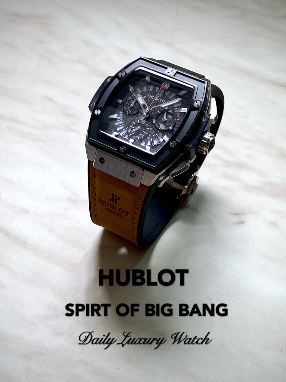 위블*의 상징적인 모델 빅뱅의 정체성과 영혼을 사각형케이스에 담은 제품으로 빅뱅의 전통적인 H모양의 나사들이 베젤을 견고하게 잡아주고 러그와 어태치먼트 부분들역시 전형적인 빅뱅 디자인 제품입니다