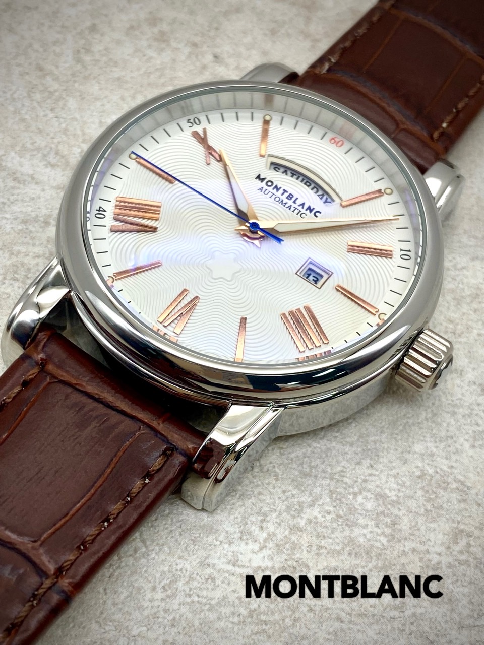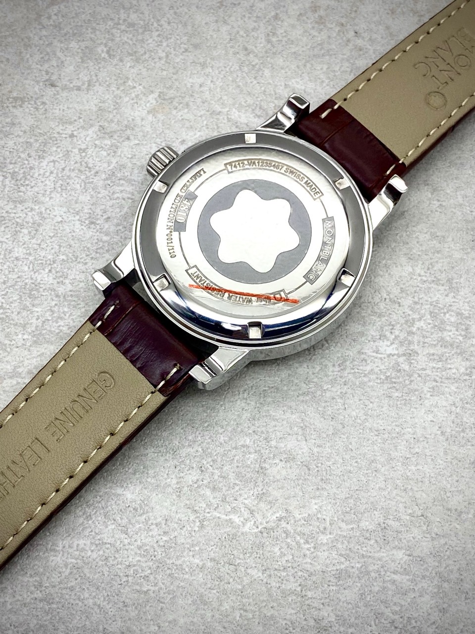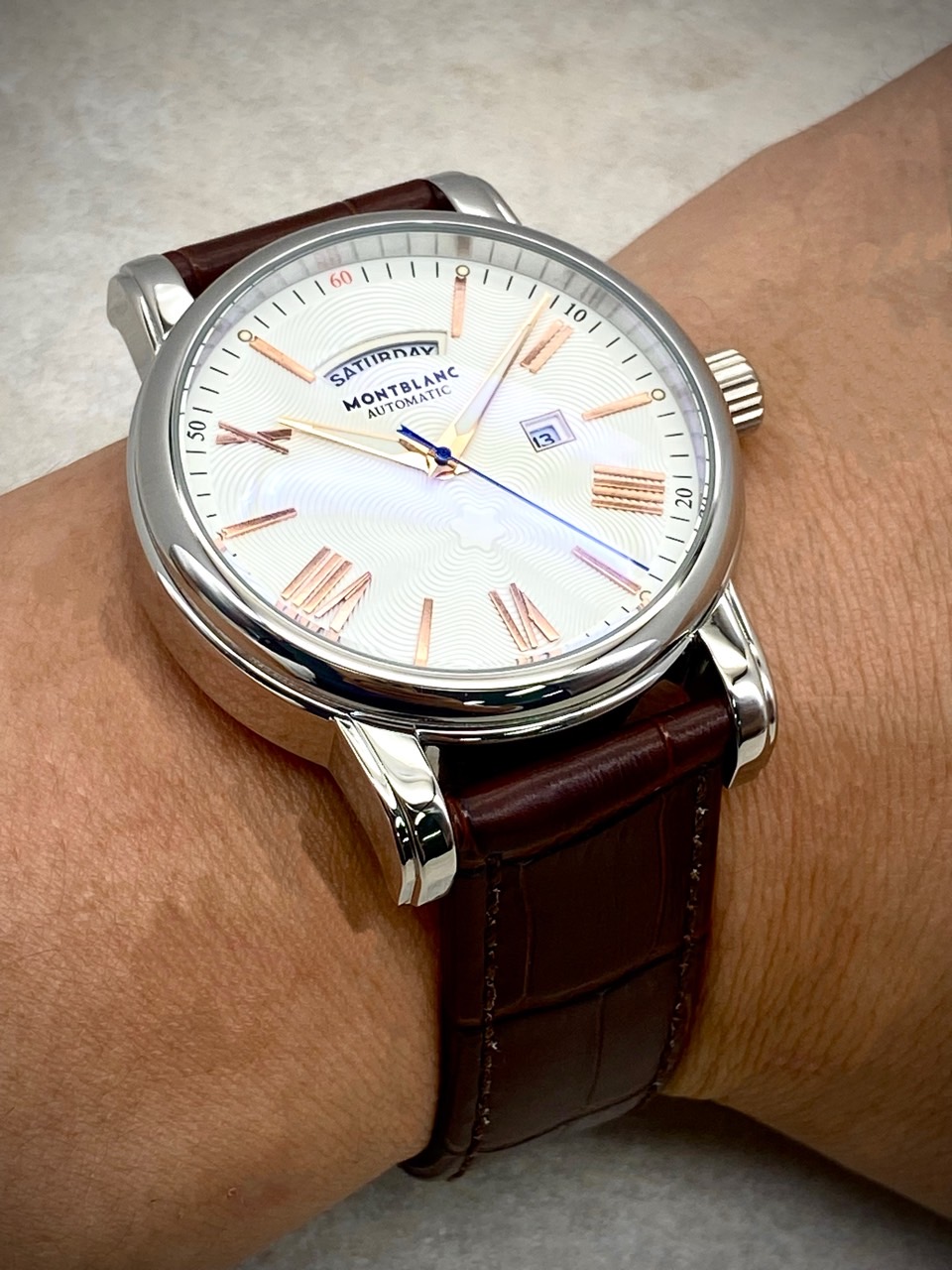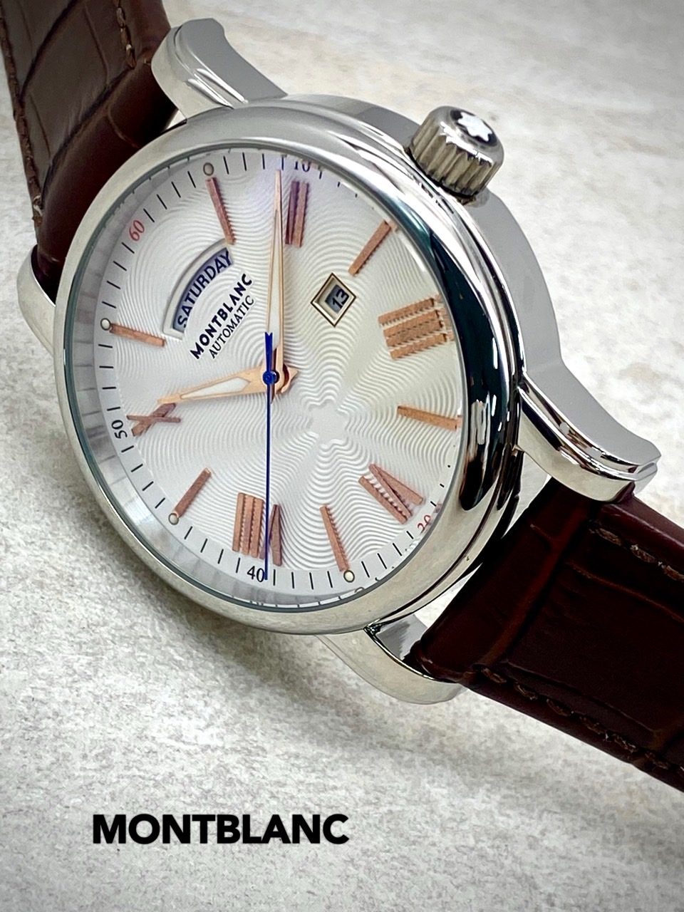 날짜 창 위로는 점진적으로 확장되는 몽블랑 스타 모양의 기요셰 인그레이빙이 몽블랑 장인의 정교한 노하우를 우아하게 드러냅니다.