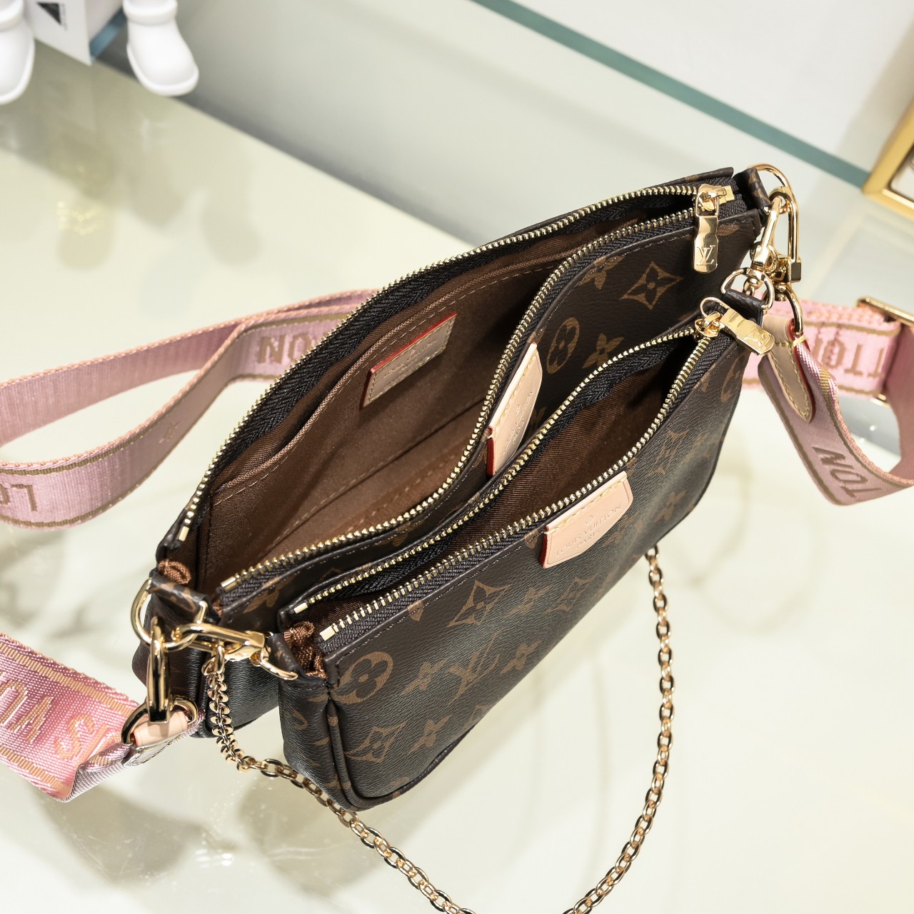 두 개의 포쉐트 모두 옆면에 미니 모노그램 패턴을 더한 모노그램 캔버스 소재의 아이템으로 다양하게 연출할 수 있는 탈착형 골드 톤 체인과 루이 비통 시그니처 디테일을 가미한 조절형 자카드 스트랩을 확인해보세요
