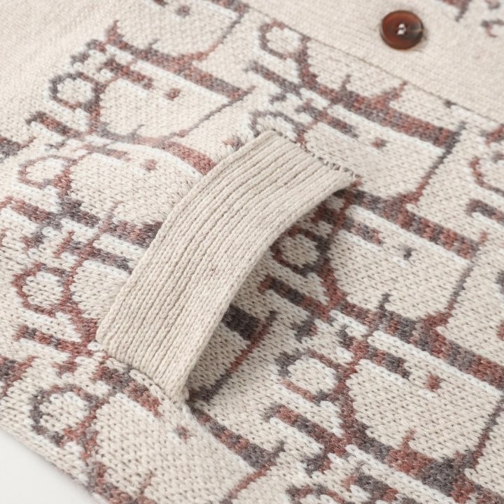 디*올 하우스의 홀마크 Dior Oblique 모티브를 새롭게 해석한 니트 가디건입니다. 베이지와 브라운 컬러가 어우러진 버진 울 자카드 소재의 캐주얼한 실루엣으로 버튼 클로저와 리브드 디테일이 디자인을 완성합니다. 다양한 룩에 매치해 그래픽적인 무드를 더할 수 있습니다.