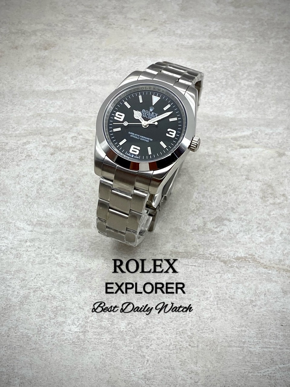익스플로러는 히말라야 등반의 경험을 바탕으로 독특한 시침과 분침을 포함하여 익스플로러를 대표하는 가독성 높은 블랙다이얼과 3시 6시 9시 방향의 대형 아라비아 숫자를 선보여 어느곳에서도 정확히 시간을 읽을수 있도록 한 디자인입니다